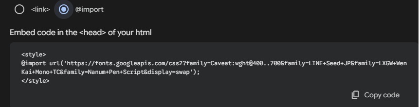 The second method provides you a line of @import codes, which you can put into the first line of your global/local CSS file (it is in fact embedded inside the <style> element which is supposed to be inserted into <head>, but I already explained why this might not be the best idea):