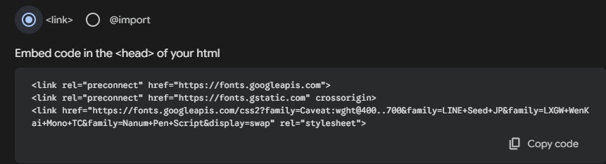 In Google Fonts, you can click on a font you like, and select the font style you need. You can include all the fonts and their styles in a list at once. Then, in a panel on the right side of the webpage, you will see the Get font button. Clicking on Get embed code as in the figure below, which provides two methods of introducing the selected fonts to your website.